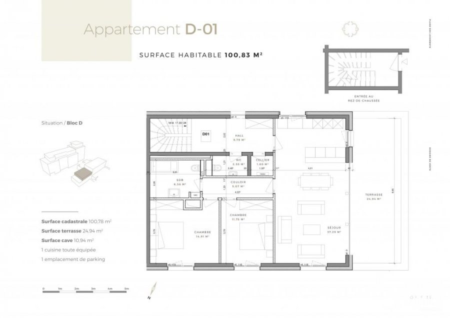 Ce bien se trouve dans cette résidenceLot D01 - Surface utile 136,71 m2 - Appartement-terrasse-jardin, de 100,83 m2 habitable, 24.94 m2 de terrasse, au premier étage dans la Résidence OPUS à Differdange.