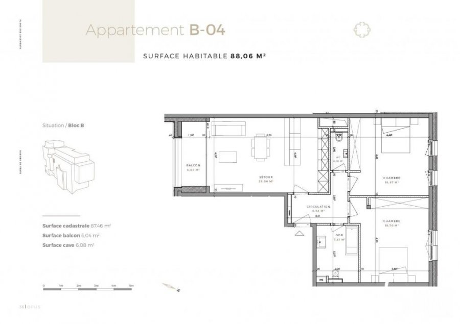 Ce bien se trouve dans cette résidenceLot B04 - Surface utile 100,18 m2 -Appartement-balcon, de 88,06 m2 habitable, 6,04 de balcon, au troisième étage avec ascenseur dans la Résidence OPUS à Differdange.