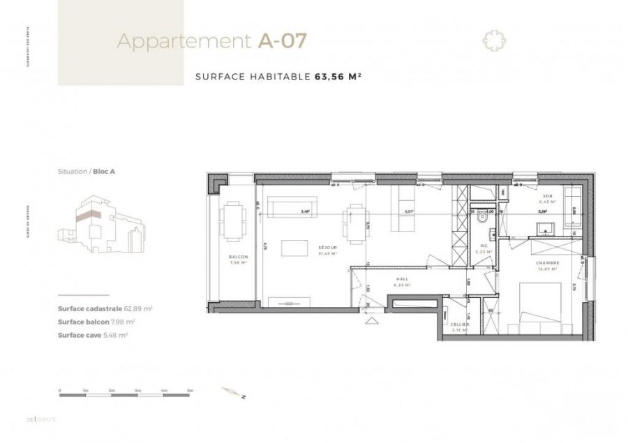 Ce bien se trouve dans cette résidenceLot A07 - Surface utile 77,02 m2 - Appartement-balcon, de 63,56 m2 habitable, 7,98 de balcon, au quatrième étage avec ascenseur dans la Résidence OPUS à Differdange.