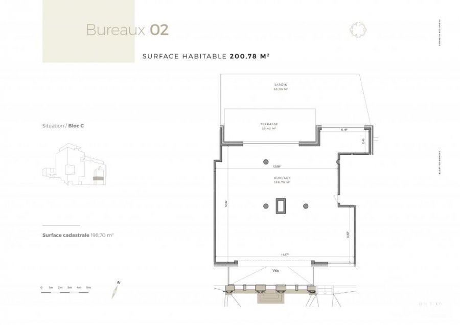 Bureau Lot 02 BU-Surface utile 298,07 m2 - Surface commercial de 200,78 m2, avec une terrasse de 33,42 m2 et un jardin de 65,95 m2.