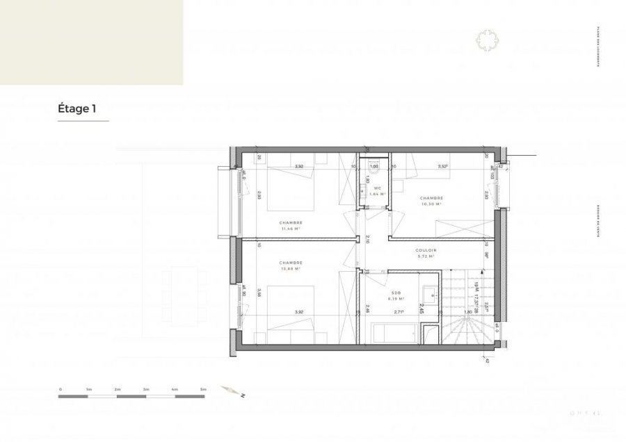 Hall de nuir, 3 chambres à coucher (10,30, 13,88 et 11.46 m2), dont 2 avec accès vers la terrasse de l'étage, salle de bain et toilette séparée .